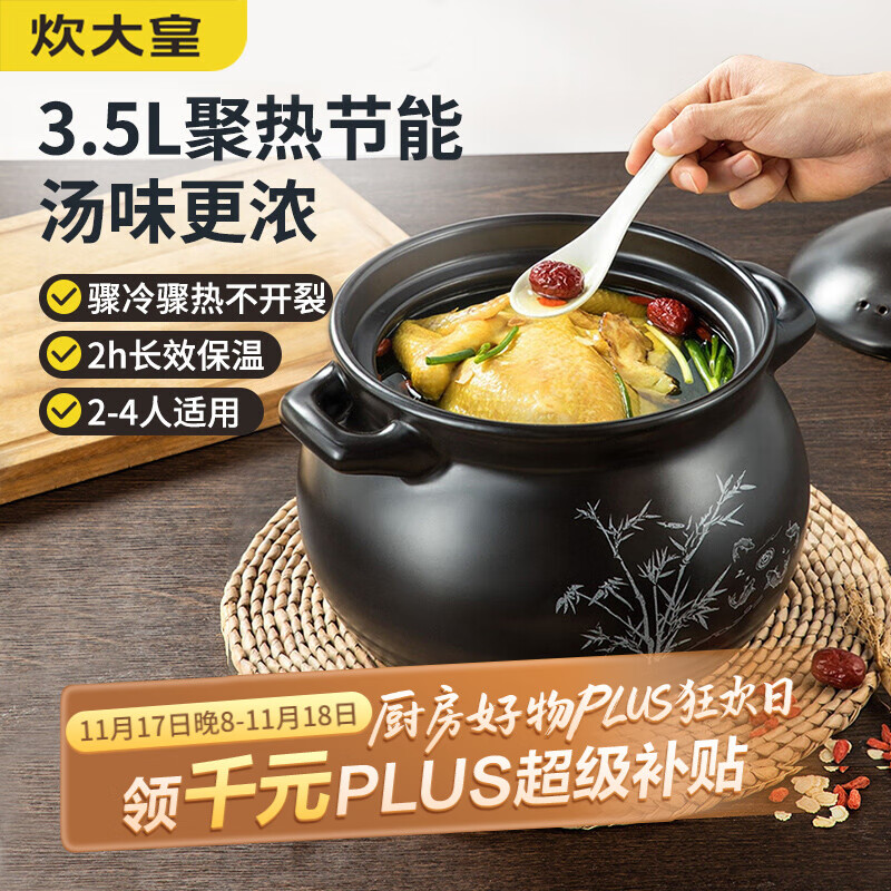 炊大皇 陶瓷煲 3.5L砂锅煲汤熬药煮粥焖饭炖锅 养生汤锅大肚煲明火使用