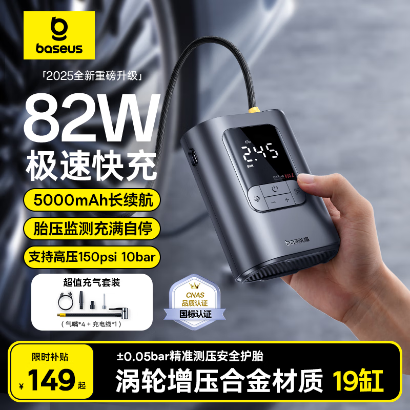 倍思车载充气泵汽车轮胎电动打气泵打气筒自行车摩托车无线充气宝测压