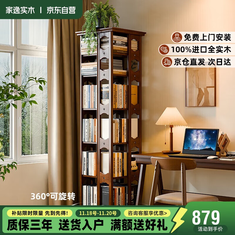 家逸旋转书架落地实木书柜360度可旋转层架落地置物架收纳架文件柜