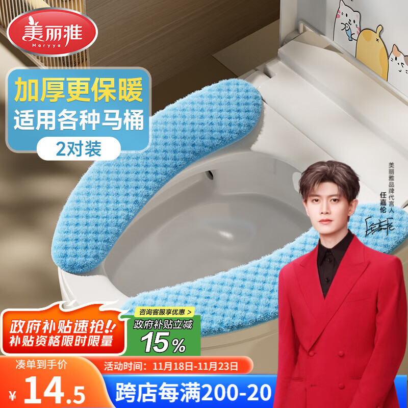 美丽雅马桶垫粘贴式坐垫冬季垫圈加厚可水洗垫子家用厕所坐便贴2对