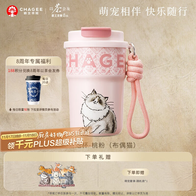 霸王茶姬(CHAGEE)保温杯316食品级不锈钢京东自营咖啡杯茶水杯子萌宠泡泡杯布偶猫