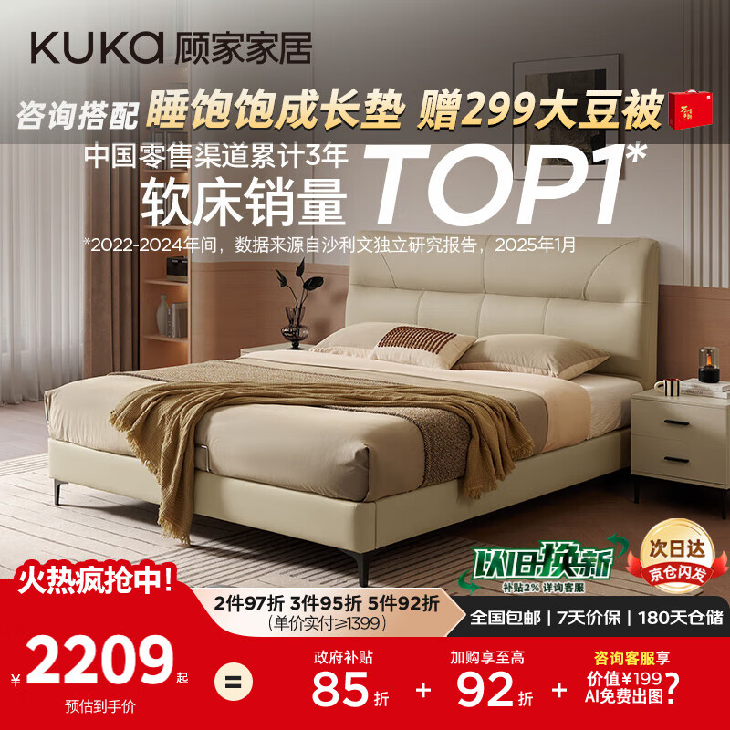 顾家家居(KUKA)京东家具头层牛皮床双人床大床分段靠包DS8227B【月牙米】高脚1.8