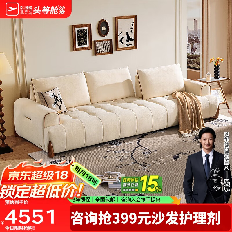 芝华仕(CHEERS)实木沙发奶油风可移动靠背泡芙沙发客厅家具白月光2081D白3.1m