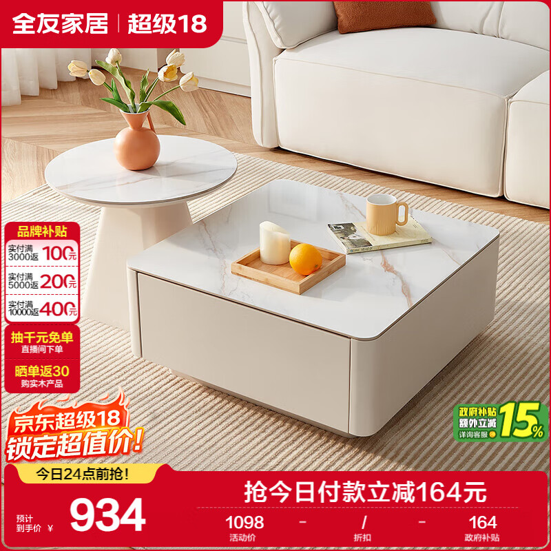 全友家居 现代简约岩板圆形小户型简易奶油风方圆茶几组合客厅家用