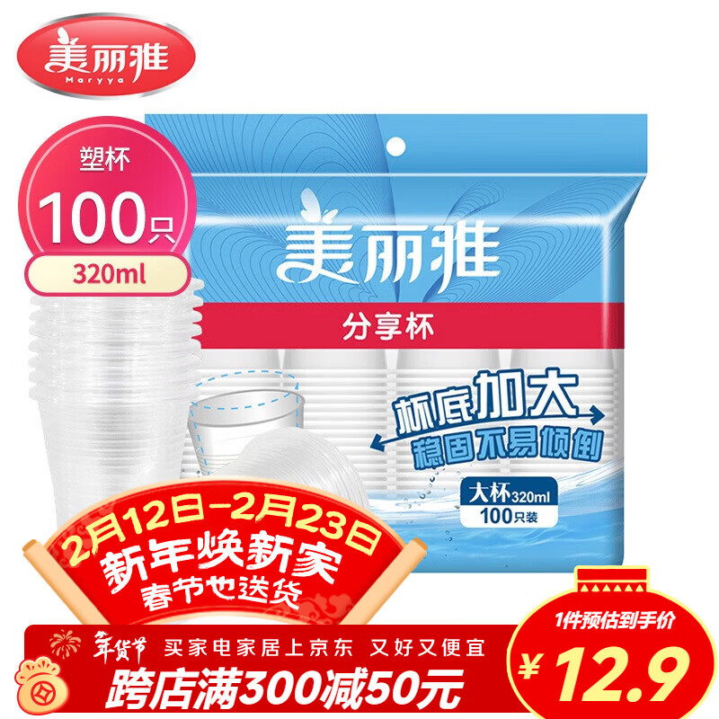 美丽雅一次性杯子塑料杯320ml*100只 加厚透明饮料水杯小号家用