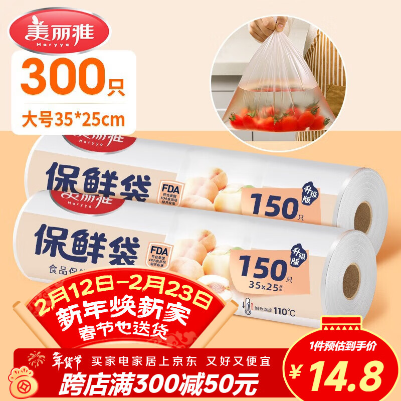 美丽雅保鲜袋食品级300只大号35*25cm加厚厨房冰箱冷藏分装塑料袋