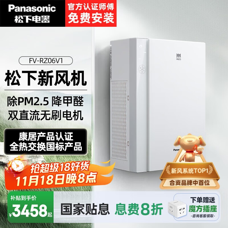 松下(Panasonic)壁挂新风系统全屋通风双向流全热交换器家用新风机FV-RZ06V1