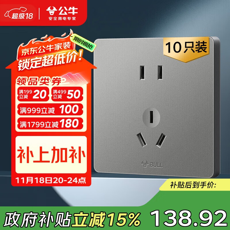 公牛(BULL)插座G12量贩装10A五孔插座86型插座面板G12Z223S星空灰10只装插座