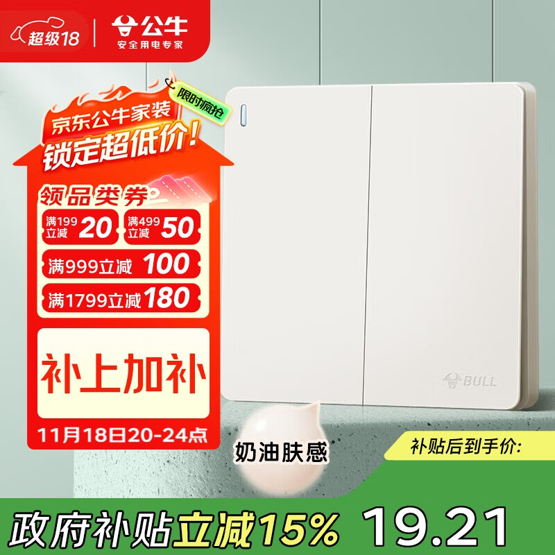公牛(BULL)开关插座G12肤感哑光奶油风二开双控开关大面板开关G12K212米绒白