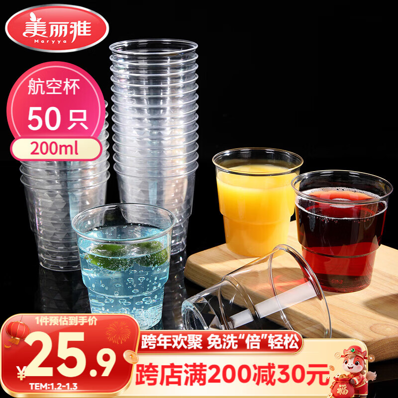 美丽雅 一次性杯子航空杯200ml*50只 食品级加厚塑料杯透明水杯饮料杯