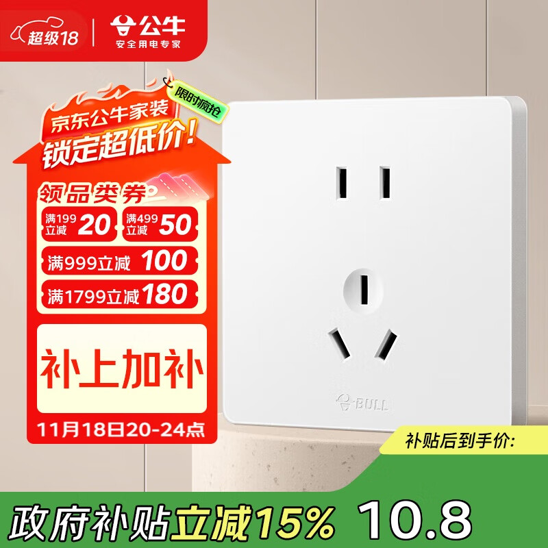 公牛(BULL)开关插座 G12系列 10A五孔插座奶油风86型面板 G12Z223S 暮雪白