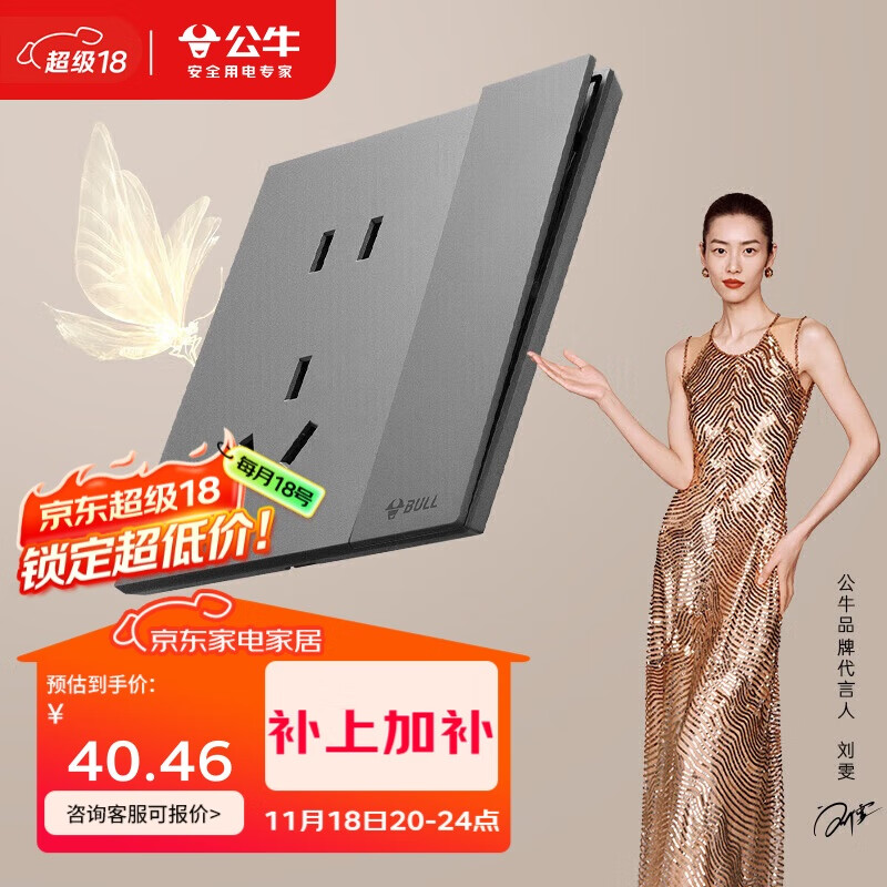 公牛(BULL)开关插座G57蝶翼超薄系列一开单控五孔带开关插座G57E333A远山灰