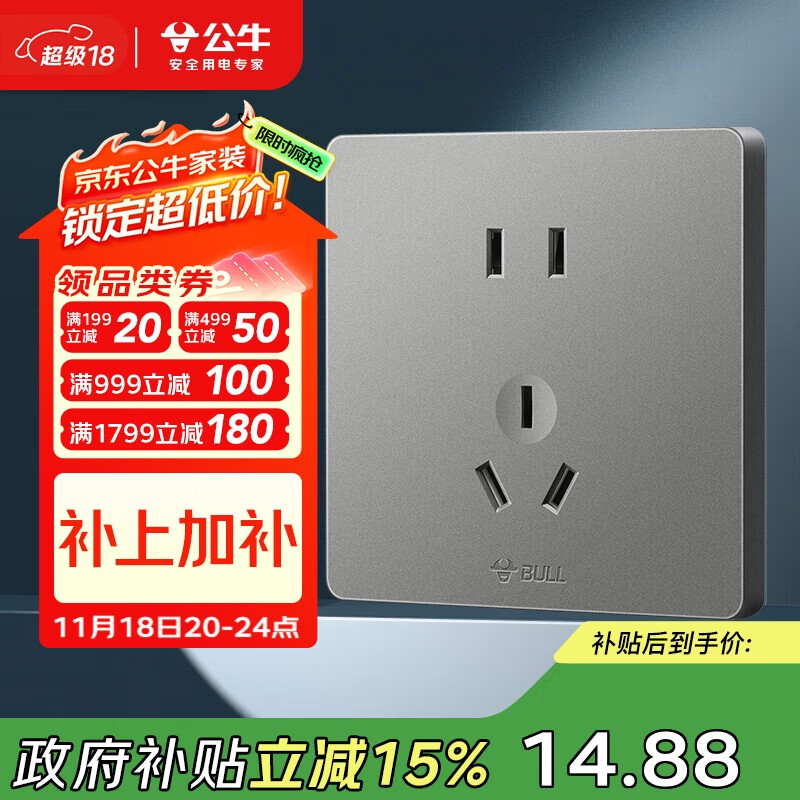 公牛(BULL)开关插座 G12系列 10A五孔插座86型插座面板G12Z223S 星空灰