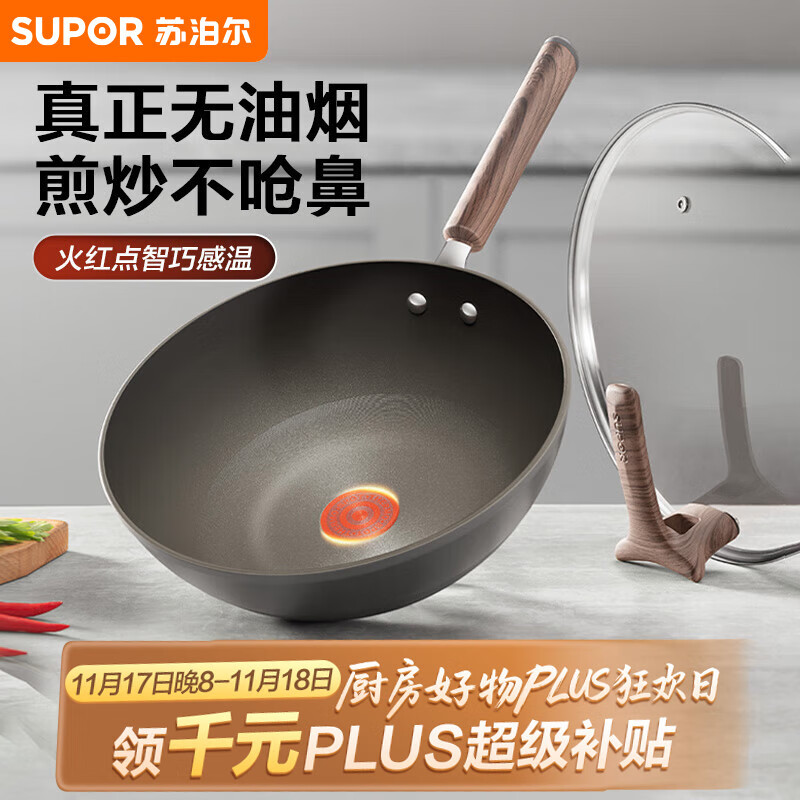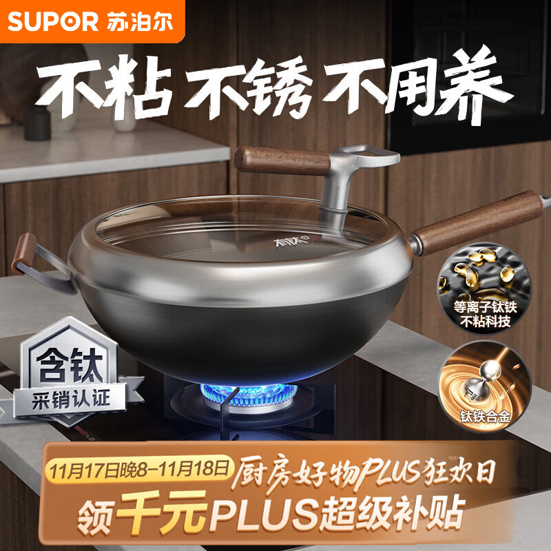 苏泊尔不粘铁锅有钛铁不粘无涂层少油烟炒锅34cm燃气电磁炉通用 CC34YT1