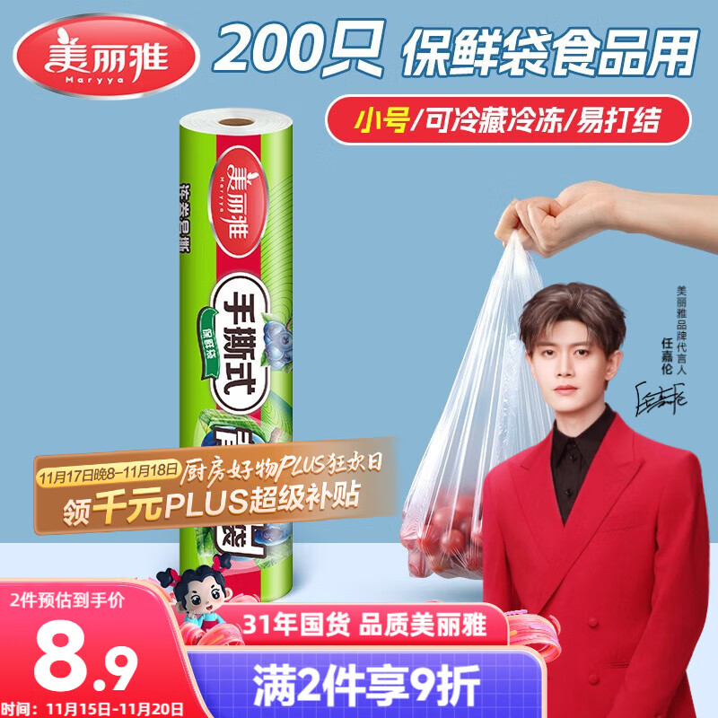 美丽雅保鲜袋背心式食品级200只 小号加厚收纳袋 一次性冰箱连卷分装袋