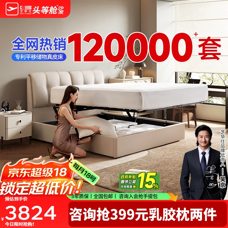 芝华仕(CHEERS)五星皮床现代主卧室大床双人真皮储物软包吐司床芝华士C265白1.8m