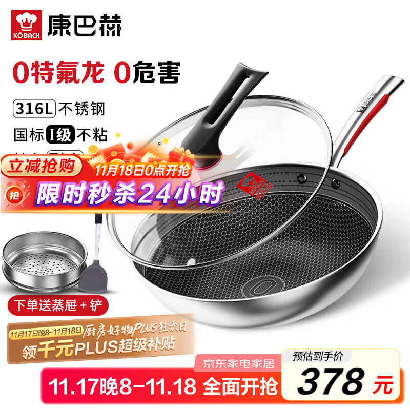 康巴赫炒锅316L不锈钢炒菜锅少油烟不粘锅家用电磁炉燃气灶通用32cm