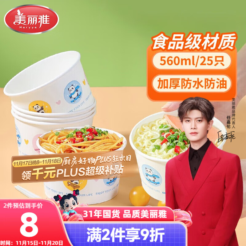 美丽雅一次性碗食品级餐盒560ml*25只 耐高温打包野餐圆形纸碗饭盒