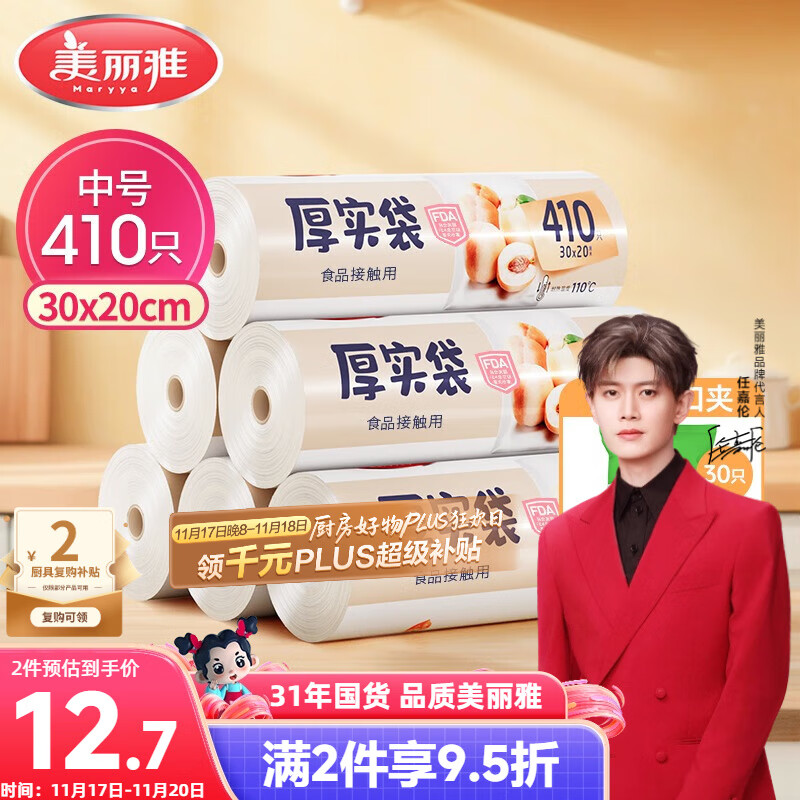美丽雅 食品级保鲜袋中号 点断式塑料家用加厚袋子 410只30*20cm