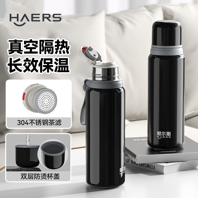 哈尔斯保温杯316L不锈钢大容量外出便携式男女士茶水分离泡茶杯黑660ml