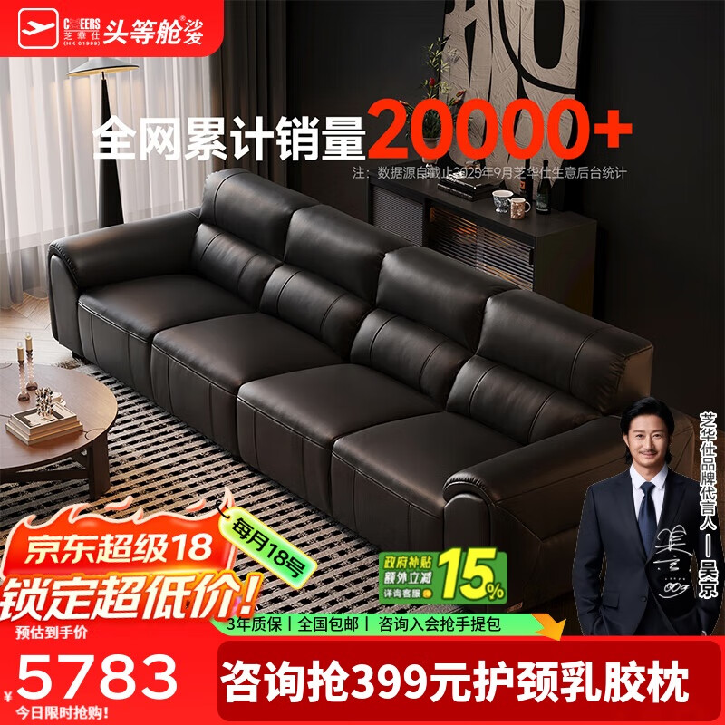芝华仕(CHEERS)都市皮沙发意式极简大户型客厅直排家具大黑牛芝华士3167黑大四