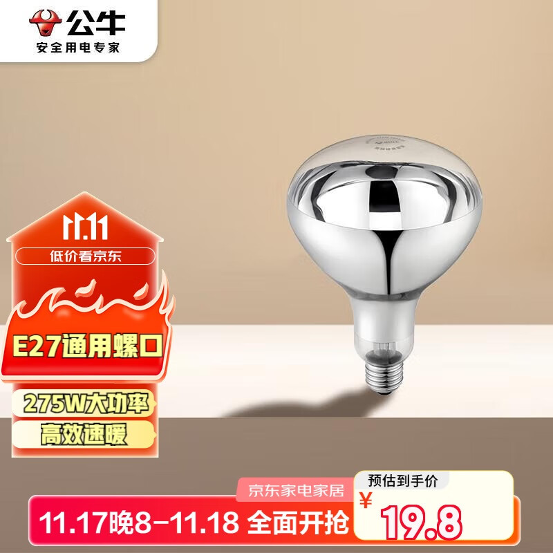 公牛(BULL)浴霸取暖泡E27螺口替换灯暖275W大功率取暖H183(mm)