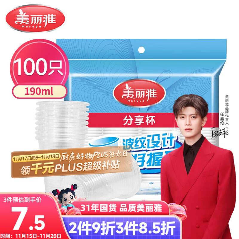 美丽雅 一次性杯子塑料杯190ml*100只加厚透明果汁饮料水杯小号家用