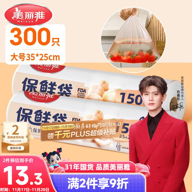 美丽雅保鲜袋食品级300只大号35*25cm加厚厨房冰箱冷藏分装塑料袋