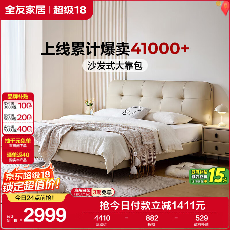 全友家居 头层牛皮床奶油风床头软包靠背卧室家用1.8米双人床政府补贴