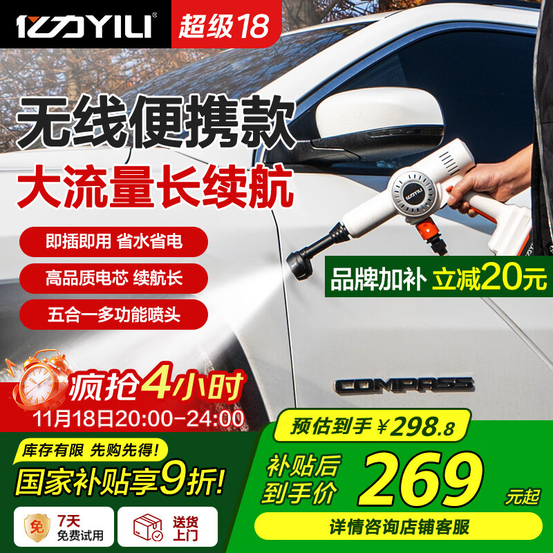 亿力无线洗车机2060D 250W家用清洗机手持锂电水枪高压喷水水枪