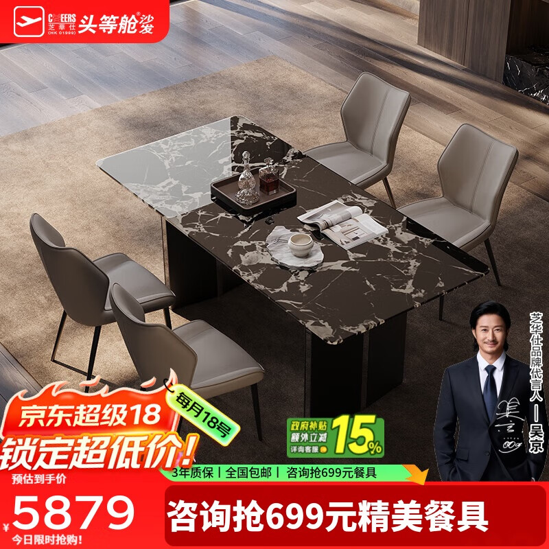 芝华仕(CHEERS)新款轻奢高级感天然大理石餐桌奢石宝格丽黑家用1.6m带四椅CT256