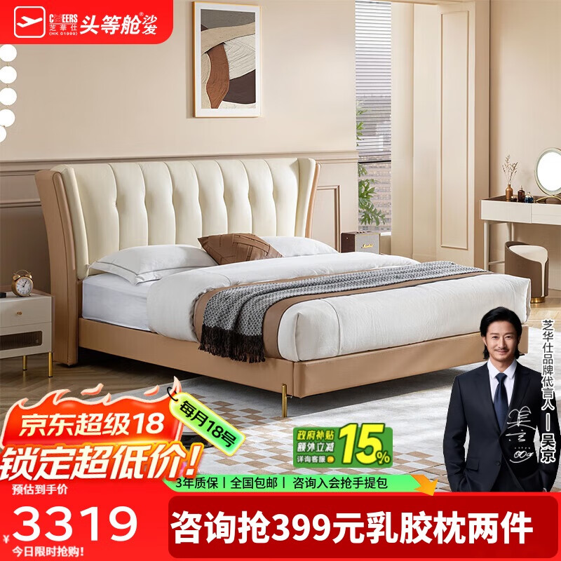 芝华仕(CHEERS)五星皮床软包床主卧室婚床带床垫芝华士C224卡其G1.8m