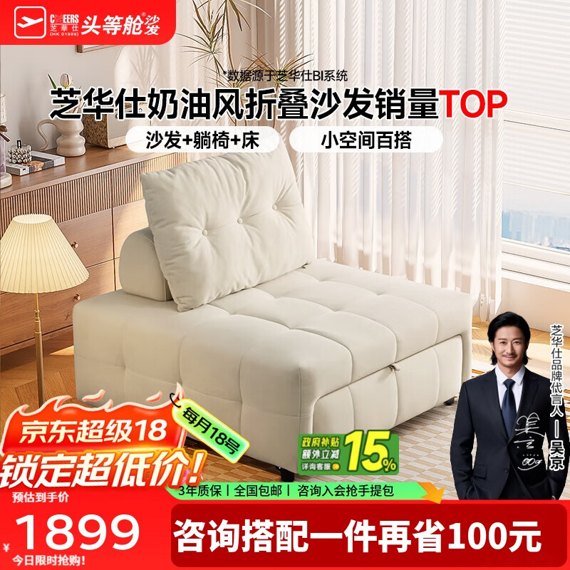 芝华仕(CHEERS)奶油风布艺沙发多功能两用小户型折叠单人沙发床芝华士6311 白单