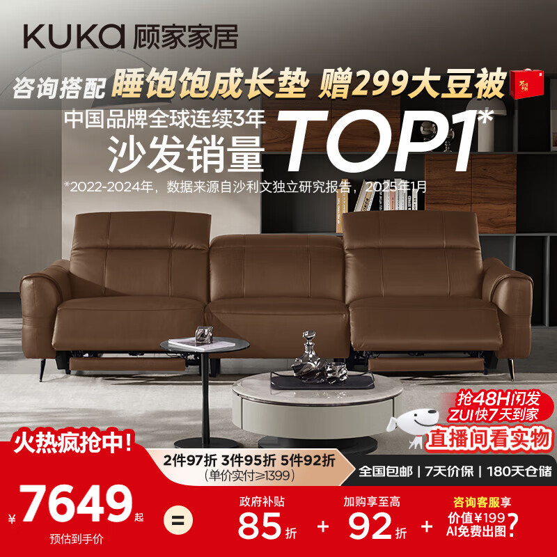 顾家家居(KUKA)门店同款电动功能皮沙发钢琴键贝多芬6236 棕3人位双电动3.01m