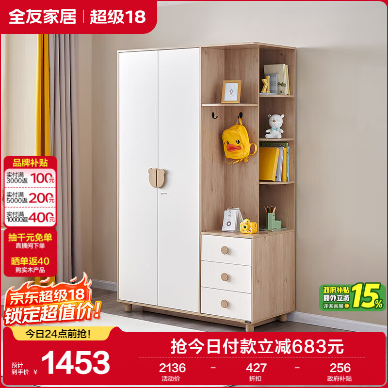 全友家居 青少年小户型卧室靠墙衣柜家用衣橱储物柜北欧风实木脚立柜