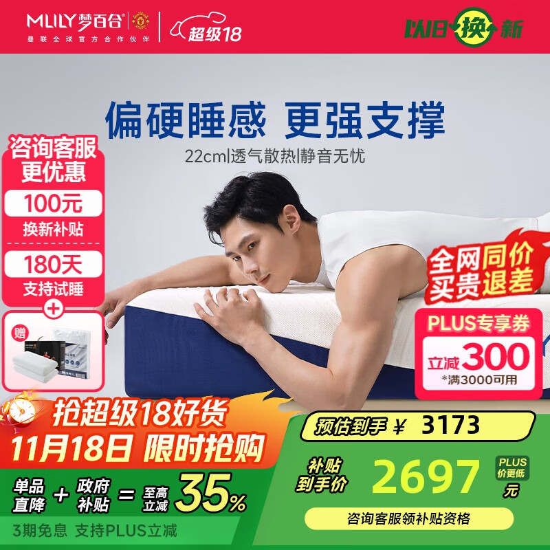 梦百合 快充小蓝钻独袋弹簧床垫双人护脊席梦思线下同款1.8*2米适中偏硬