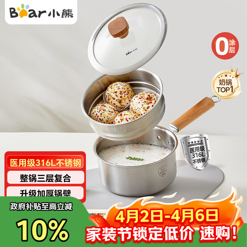 小熊(Bear)奶锅 316L不锈钢婴儿宝宝辅食锅小奶锅加厚汤锅煮面锅带蒸笼18cm