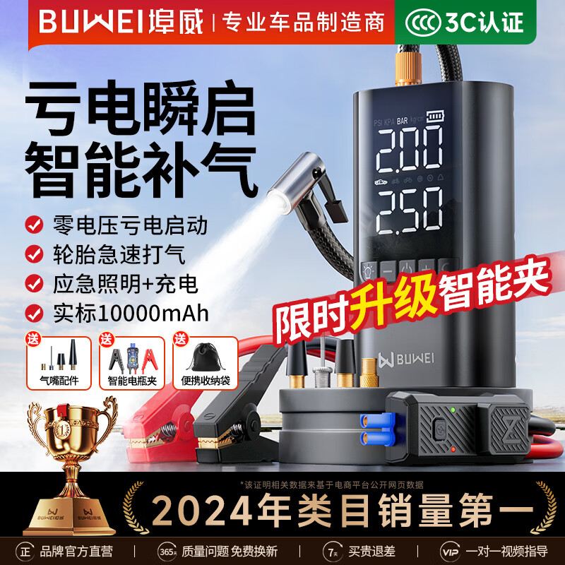 埠威BUWEI汽车应急启动电源充气泵一体机车载电瓶搭电宝打气搭电户外充电宝移动电源打火10000mAh