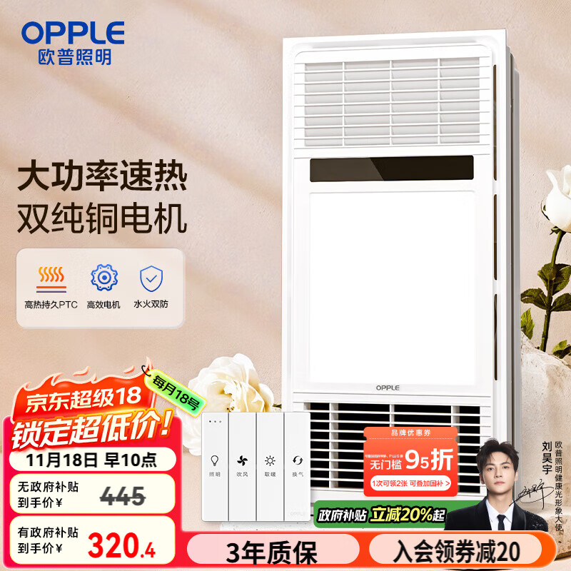欧普(OPPLE)双纯铜电机风暖浴霸灯暖风照明排气一体集成吊顶卫生间浴室F165-E