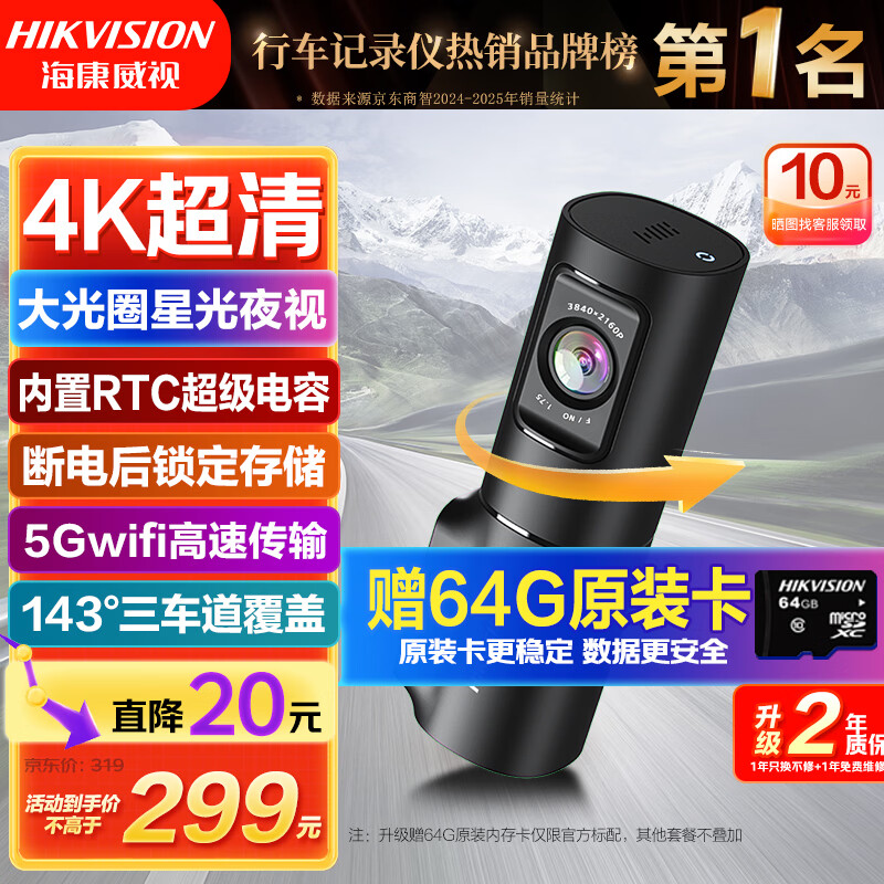 HIKVISION海康威视行车记录仪D6 4k超高清星光夜视5GWiFi 超级电容大广角