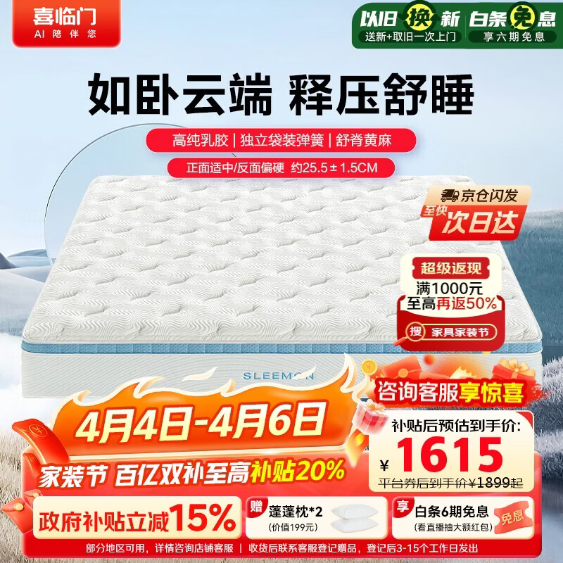 喜临门云朗pro床垫 泰国高纯乳胶 舒脊黄麻弹簧席梦思1.8x2米软硬适中