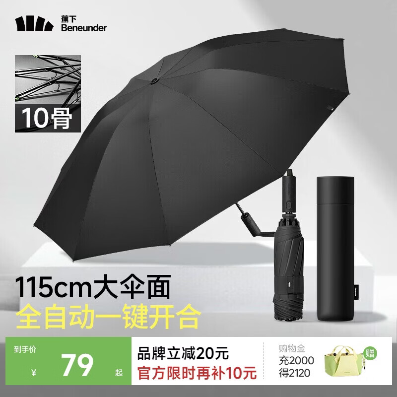 蕉下(beneunder)全自动雨伞三折加固折叠10骨伞石岩黑