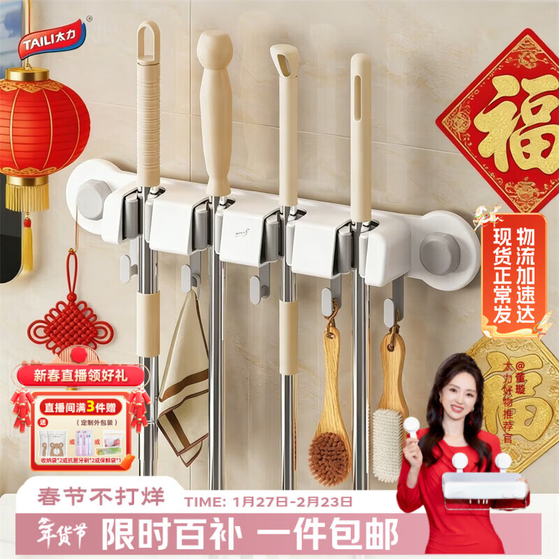 太力吸盘拖把夹免打孔联排挂钩壁挂卫生间卡扣固定器置物架 4夹5钩