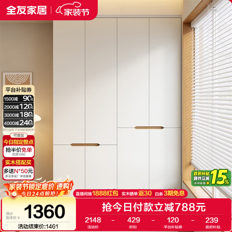 全友家居简约奶油风加高四门衣柜卧室家用衣橱衣服收纳储物柜一体靠墙