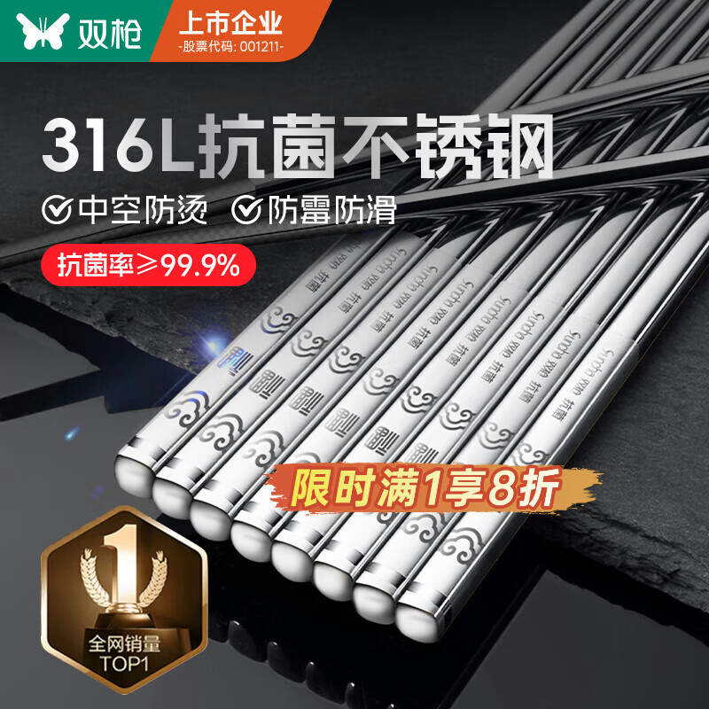 双枪316L不锈钢筷子防滑不发霉食品级家用酒店餐具 福字圆筷10双装