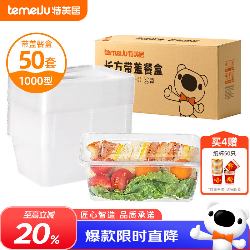 特美居(temeiju)一次性饭盒长方形透明塑料快餐盒加厚带盖打包盒餐具50套装1000型