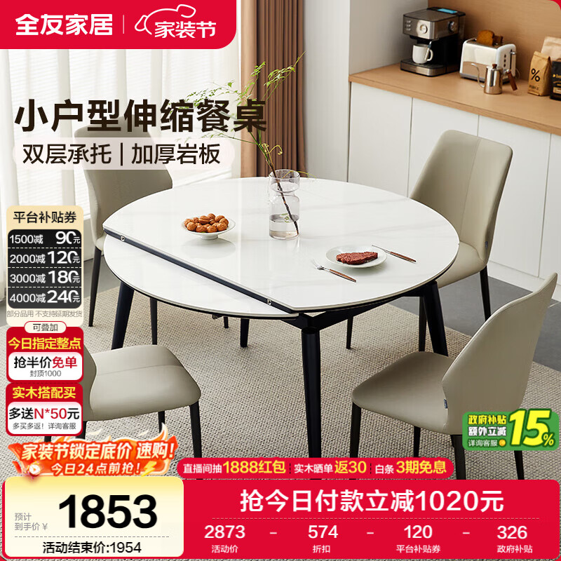 全友家居 岩板伸缩功能餐桌可变圆桌轻奢高级感小户型餐桌家用4-6人
