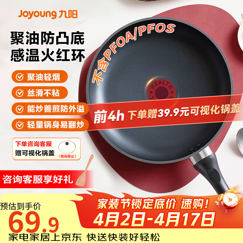 九阳(Joyoung)平底锅不粘锅家用聚油牛排煎锅火红环控温早餐锅通用炉灶26cm