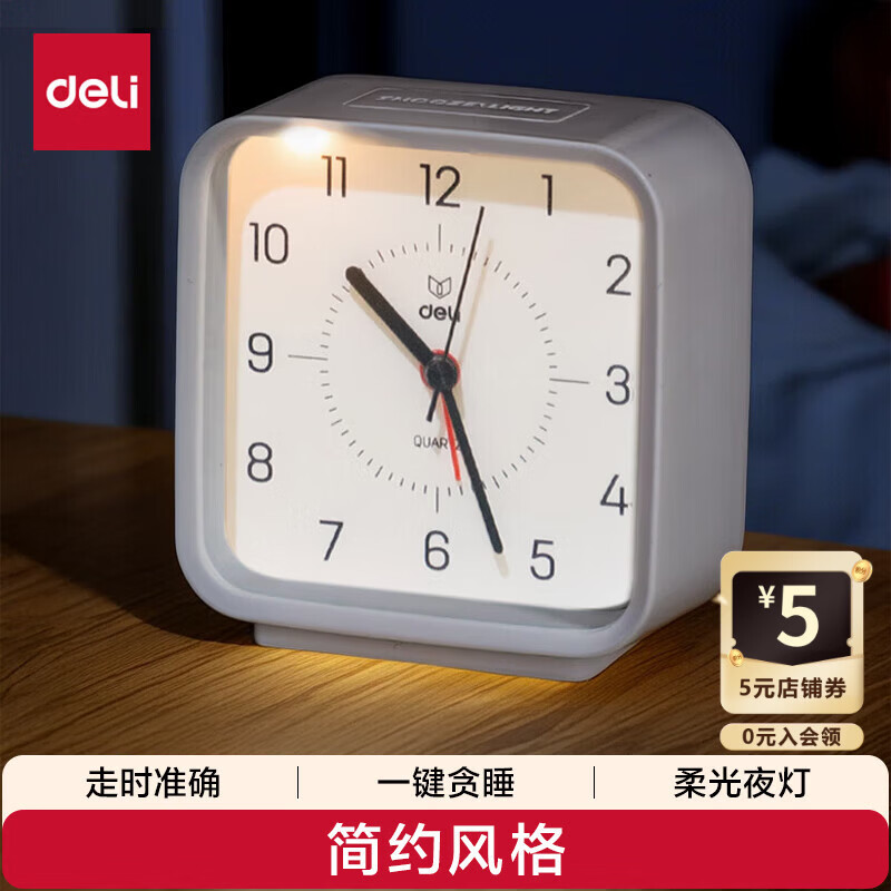 得力儿童节方形简约指针闹钟柔光夜灯台式时尚座钟起床神器 开学升学季必备 白色8851开学新年礼物