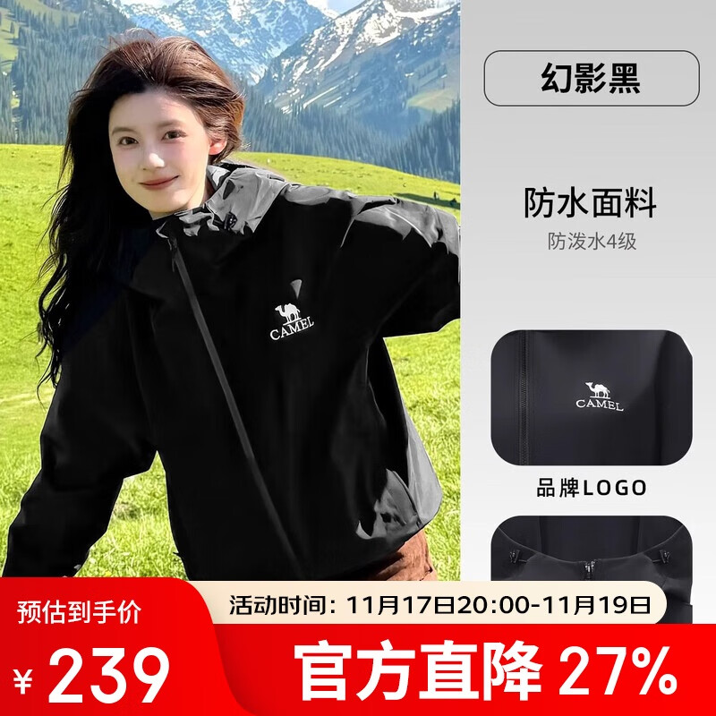 骆驼女装软壳衣女防风防水外套加绒保暖锁温抗静电连帽夹克男